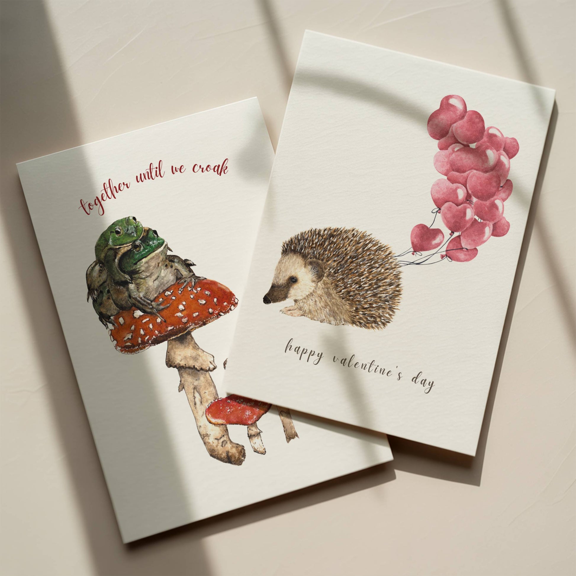 Watercolor Valentine's Day card for your boyfriend, girlfriend, husband or wife. It has toadstools and cute frogs on it. The perfect small Valentines Day gift for your loved one.