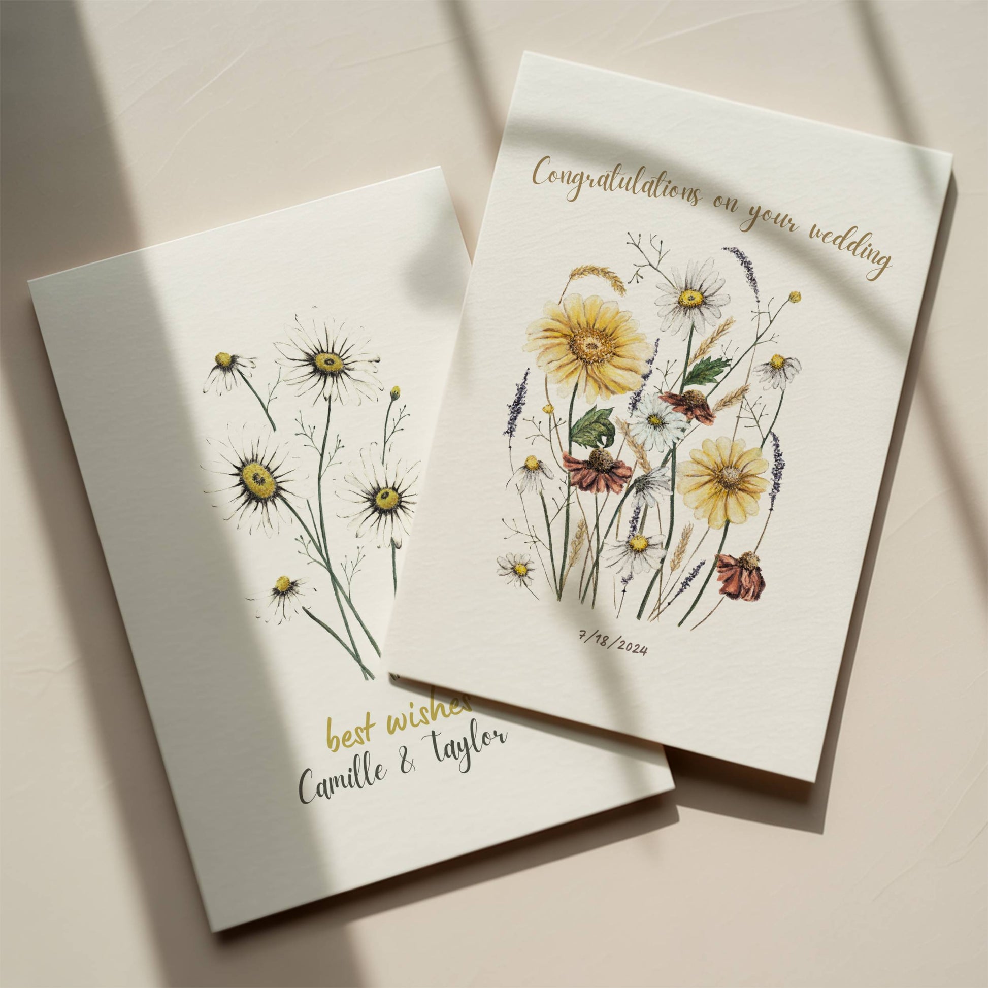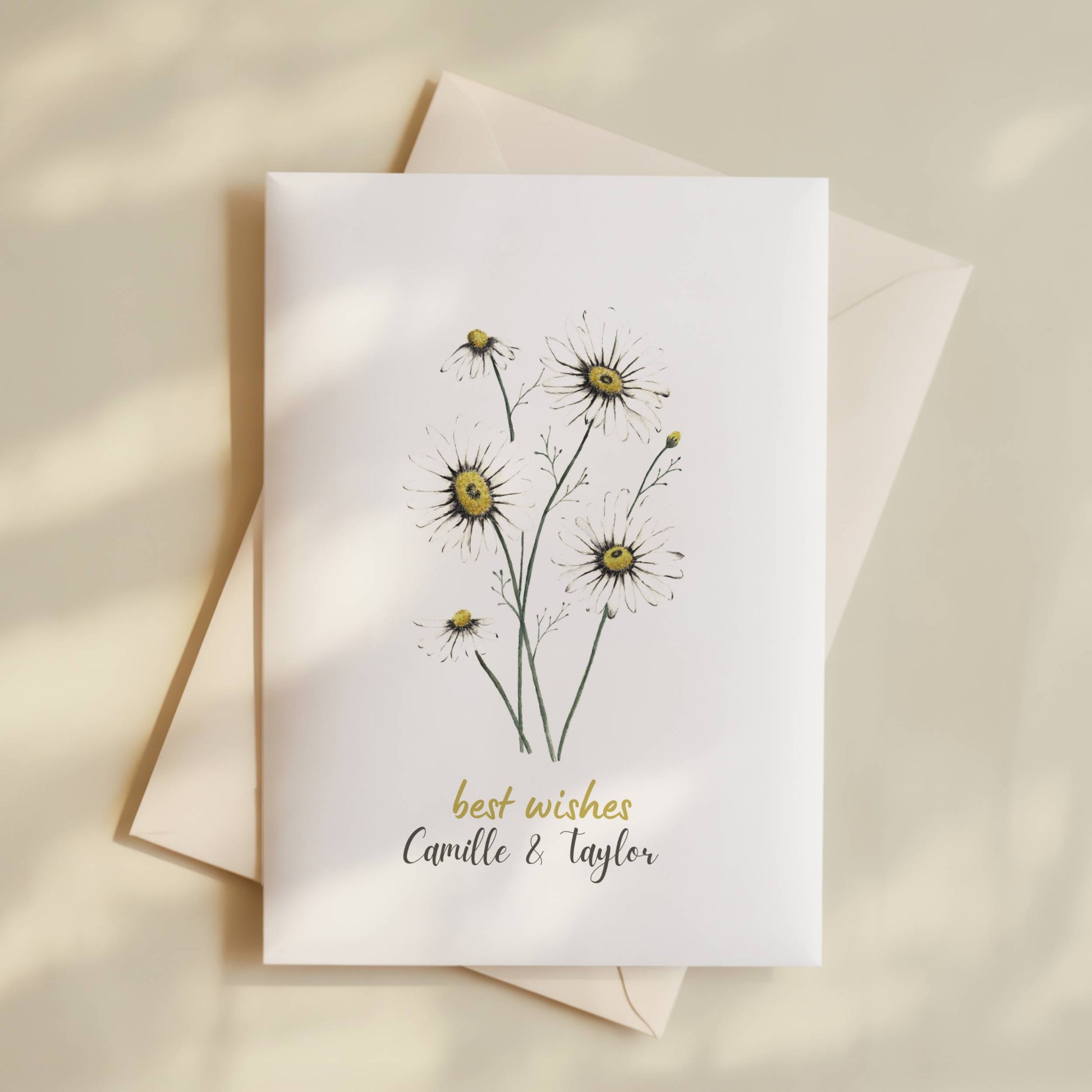 Celebrate love with this elegant personalised name wedding card, featuring a soft watercolor illustration of dainty daisies. A timeless and romantic design, perfect for congratulating a newly married couple and marking their special day.